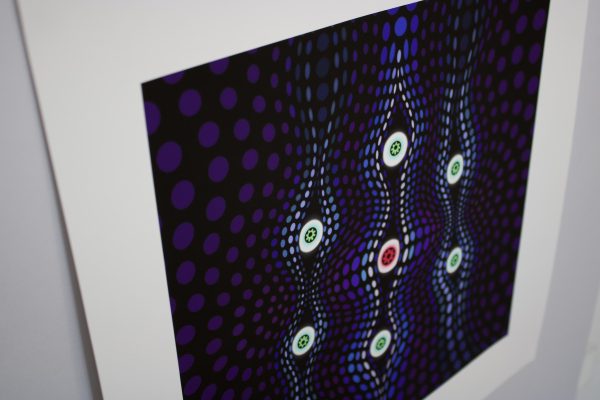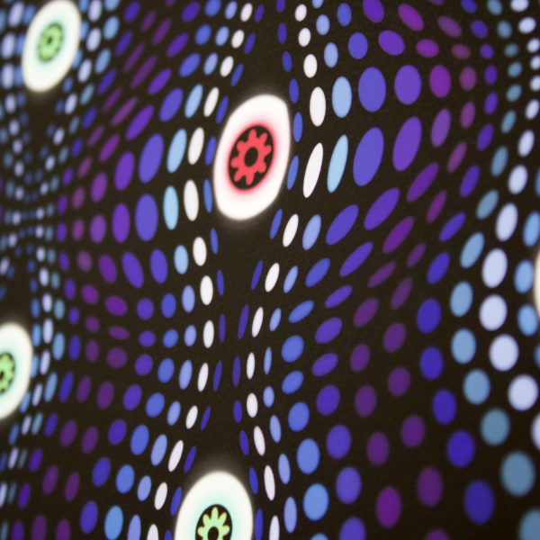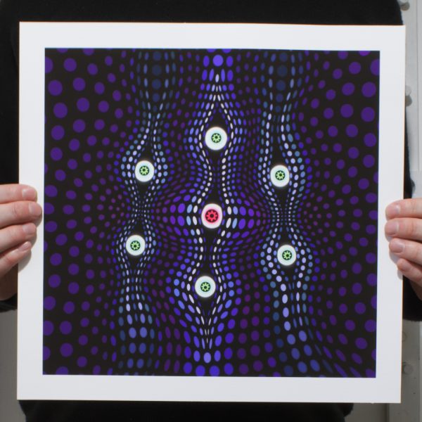 This print explores the process of seeing an aspect of your life clearly for the first time, as if you have pierced a veil that was previously obscuring your view. A revelation like ‘ah-ha’ moment when the ‘light bulb’ gets switched on and everything suddenly makes sense and is seen in a new, fresh light. The metaphorical veil which is pierced is represented by the strings of ellipses, these are pulled back like curtains to reveal the eye like motifs that can now see things clearly.